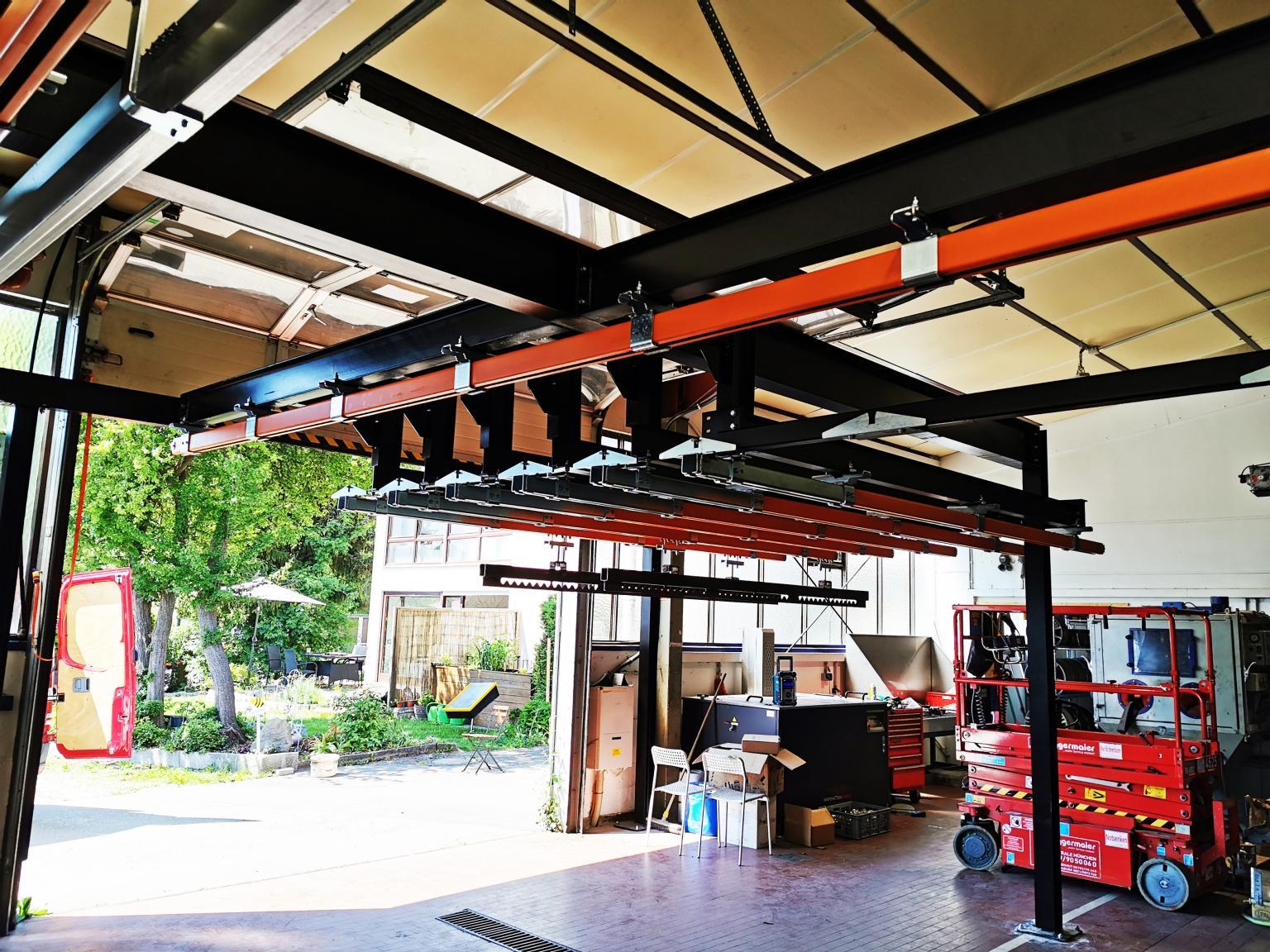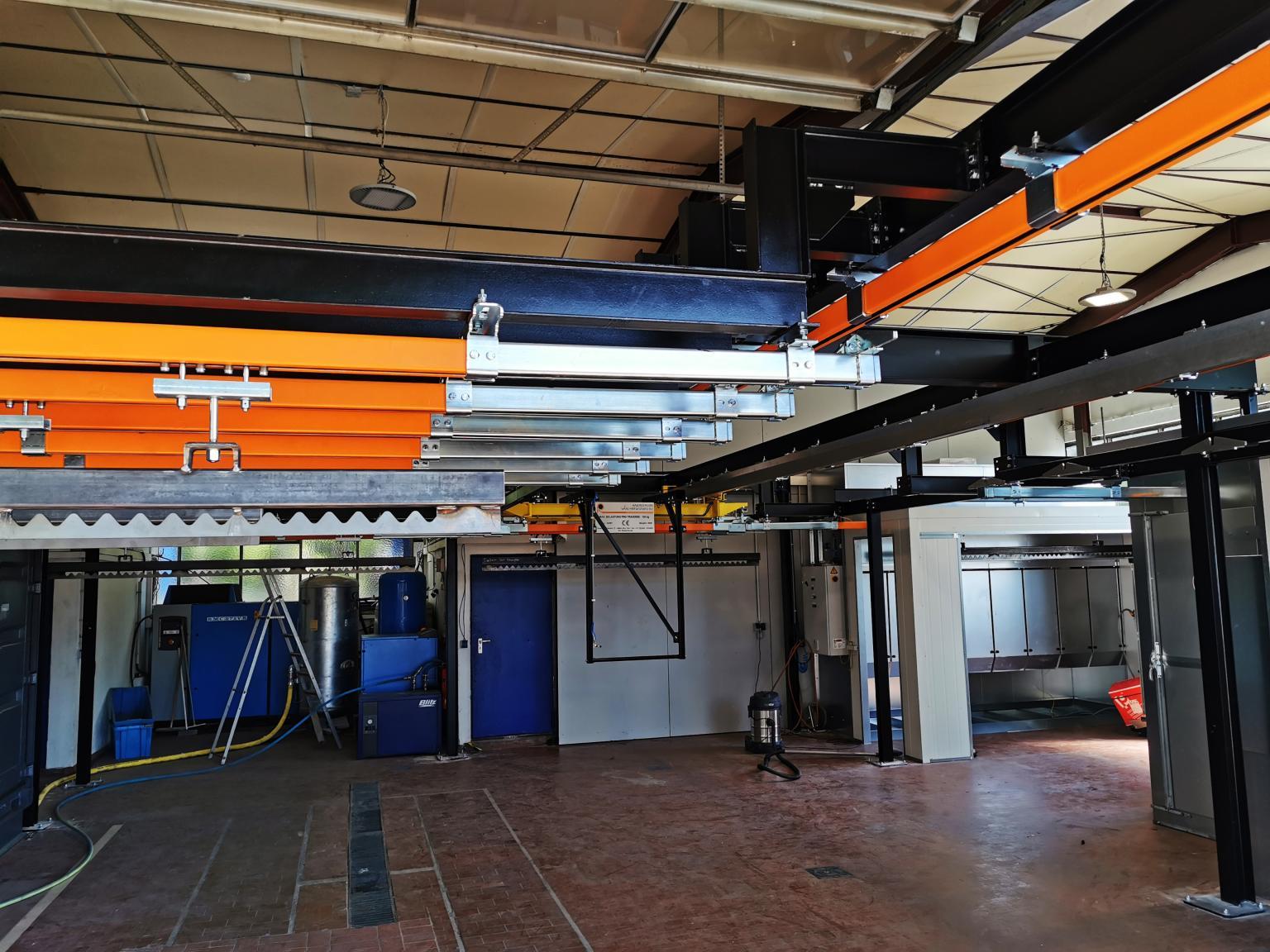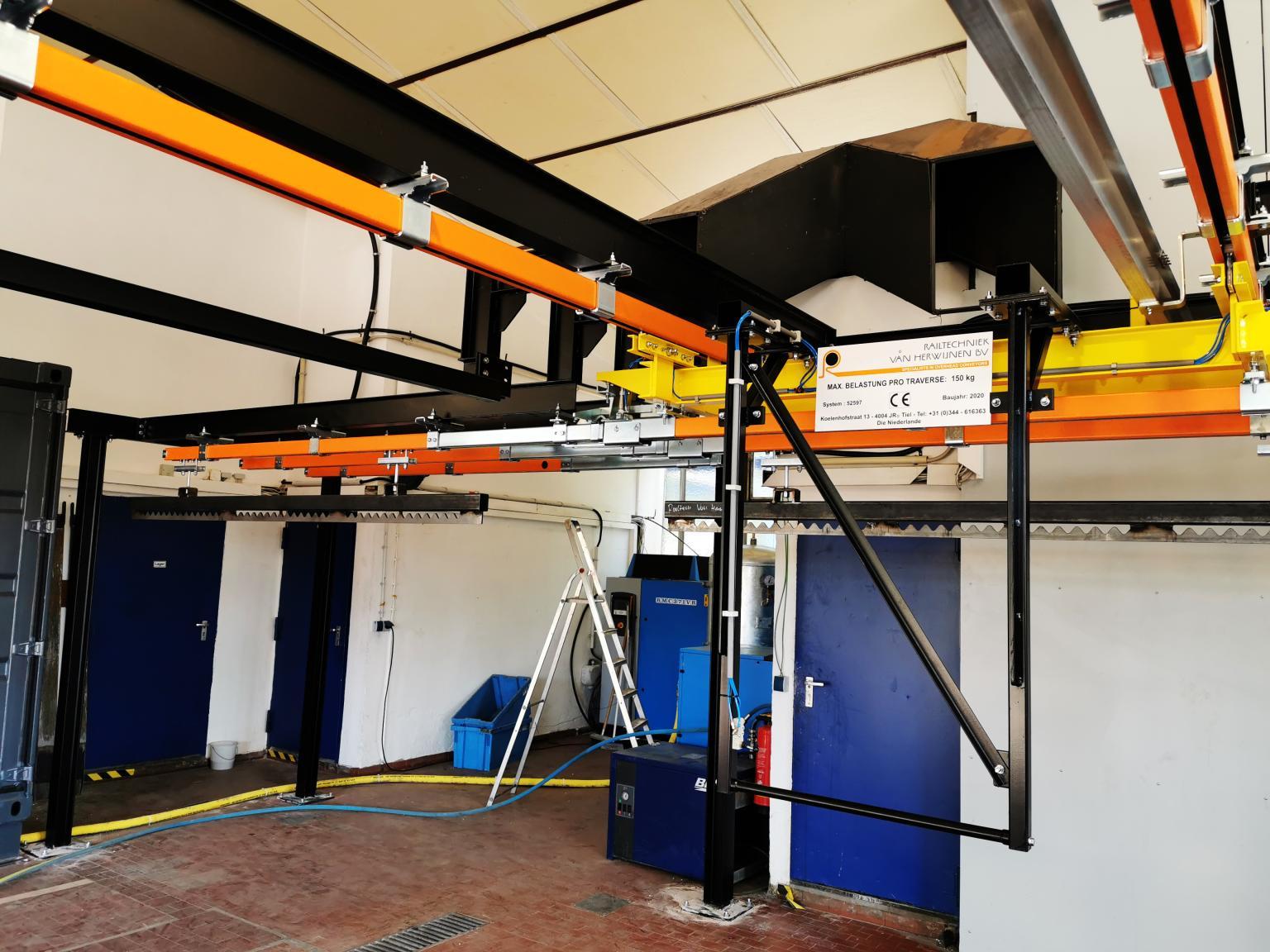 In cooperation with Glasbeek Finish B.V., Railtechniek van Herwijnen BV supplied a cassette monorail system to S&P in Germany. This system offers the possibility of powder coating long products. The advantage is that the system can be housed in a compact space.