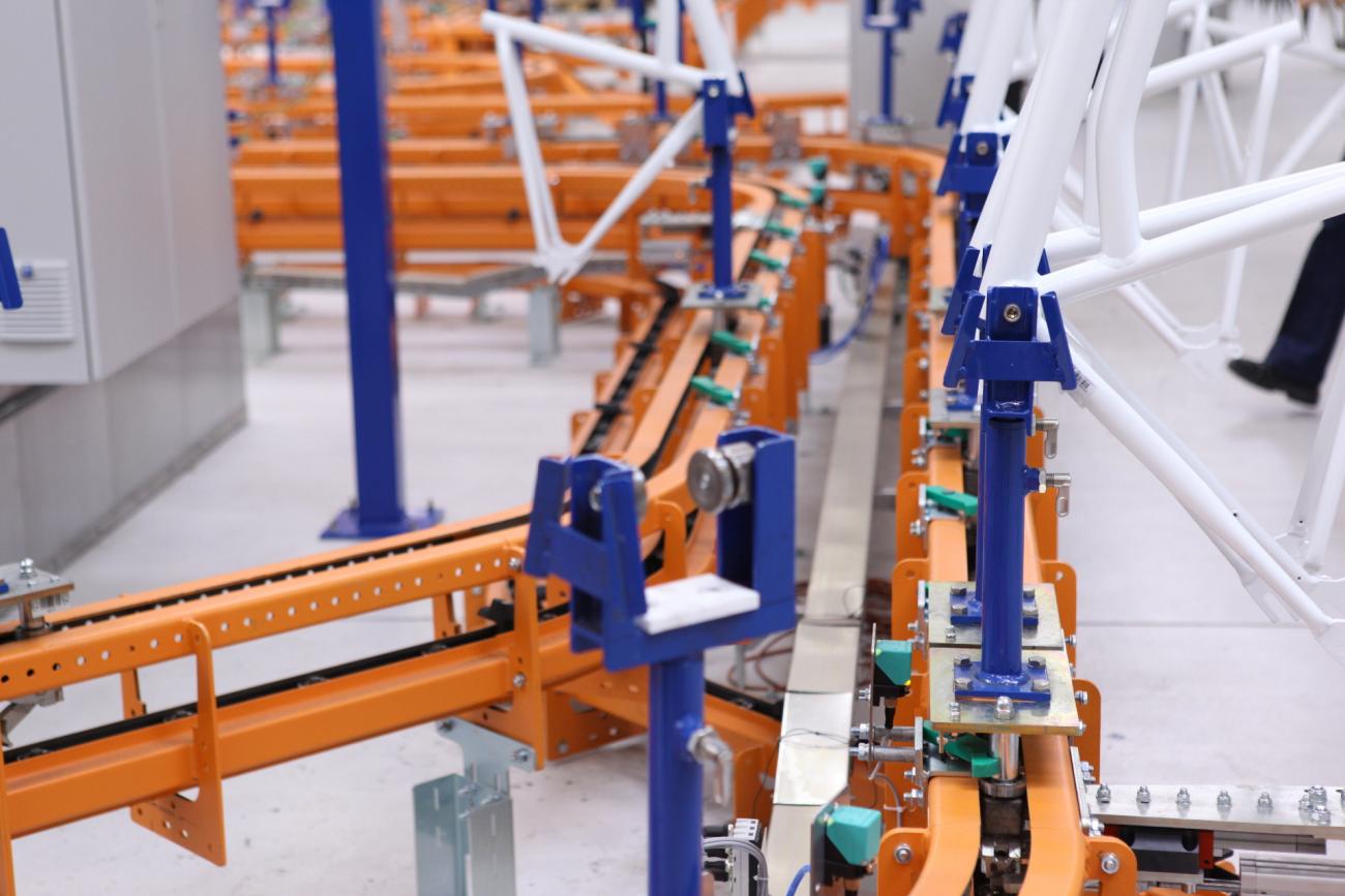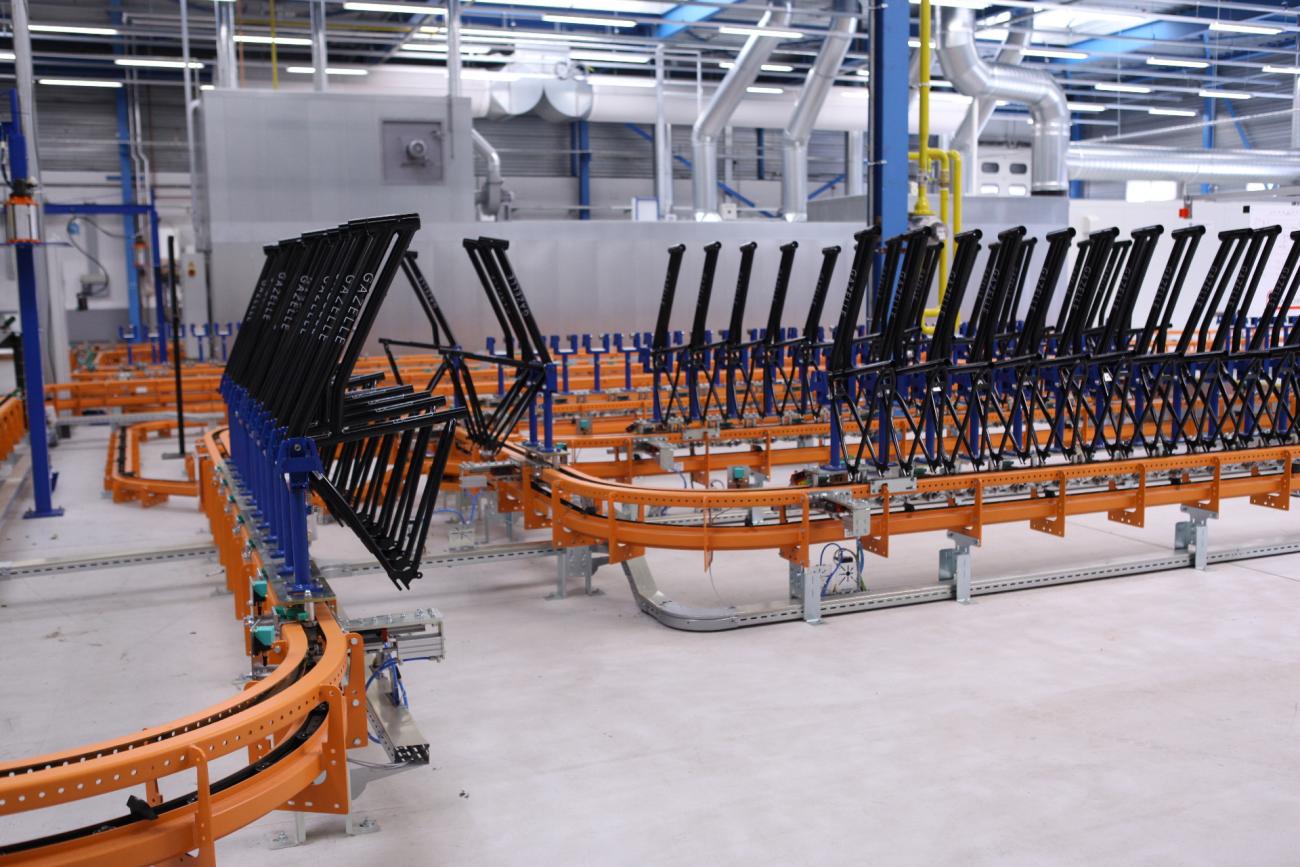 The F1 Power and Free floor conveyor system is based on the inverted version of our T1 Power & Free overhead conveyor. Since the conveyor chain is located below the free track and the product carrier, the risk of contamination to the product being carried is minimal.